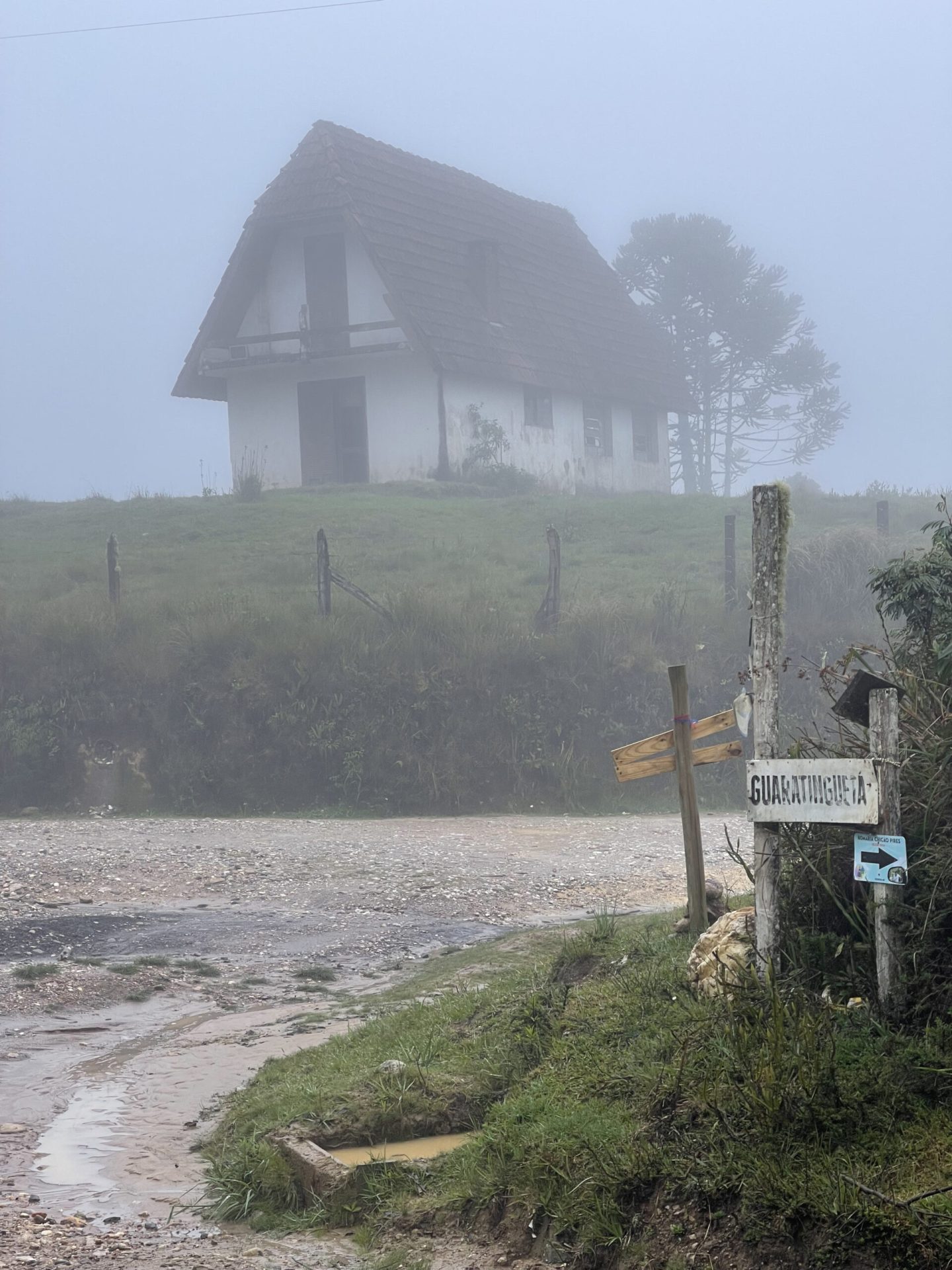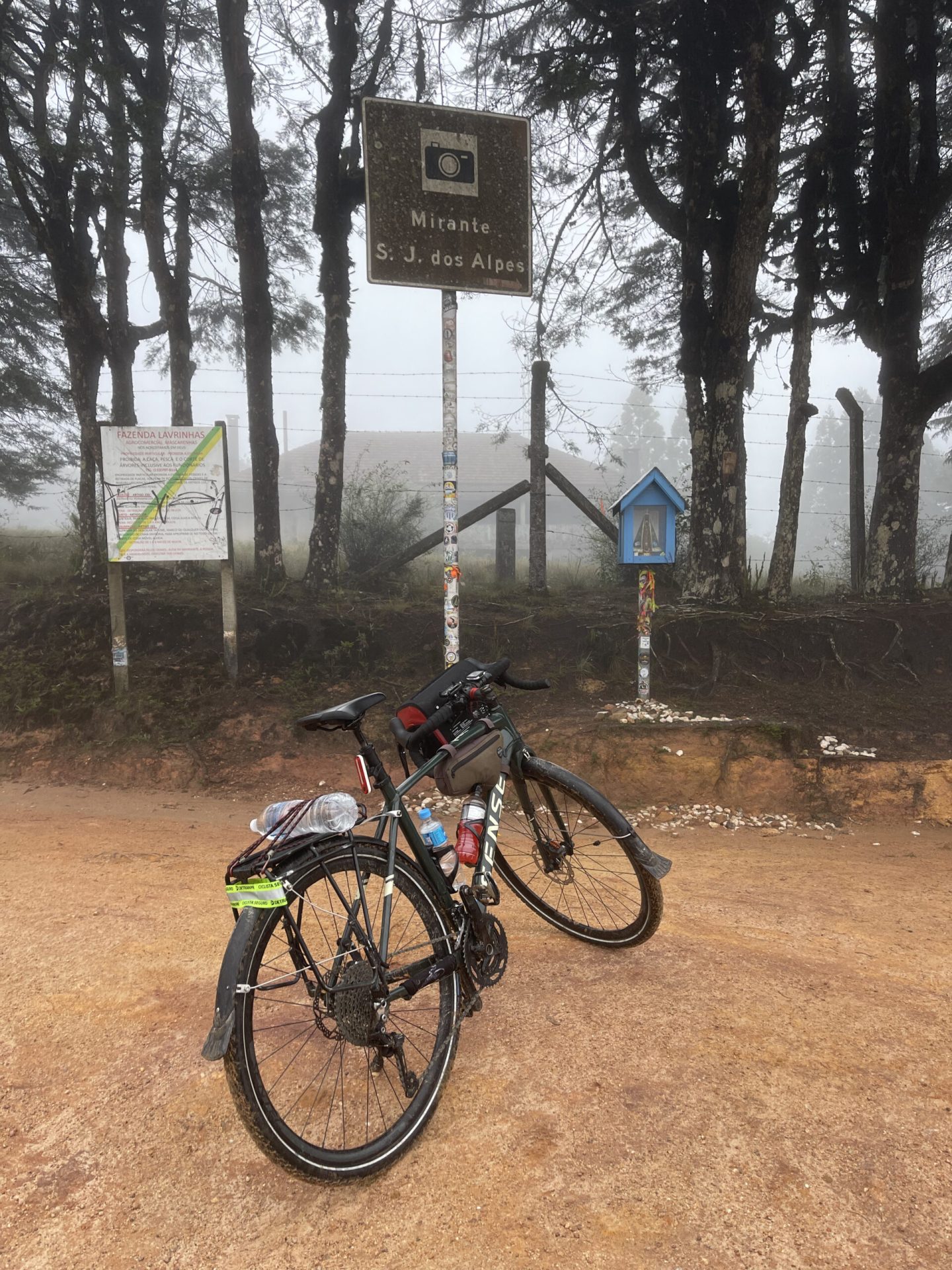 Agradeci a todos, desejando um bom pedal e deixei a pousada rumo à saída para o Horto Florestal, seguindo pela Avenida Pedro Paulo, quando me deparei com a seta amarela no Km 50; continuei em frente, passando da entrada, os mineiros me chamaram, retornei e já ouvia aquelas brincadeiras da Germana: “Quer moleza uai?! Quer pedalar só no asfalto?!”. Aos risos, fizemos uma foto embaixo da placa que sinalizava Mirante – São José dos Alpes. Ali, antes do horto, à direita começava a estrada de terra larga, arborizada, que segue para a Serra das Pedrinhas. Depois de 6 km de subida – um mirante do Pau Arcado, havia uma cortina de cerração, e eu não conseguia ver nada.